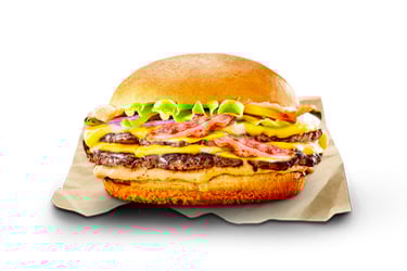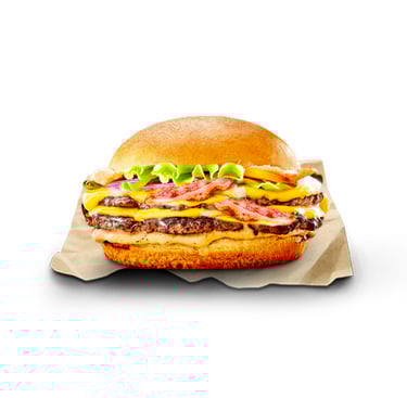 Potato bun, double steak smash, bacon de bœuf, cheddar, sauce maison, salade, tomate, oignons rouges.