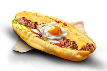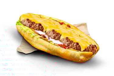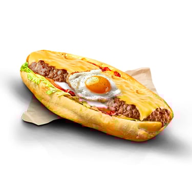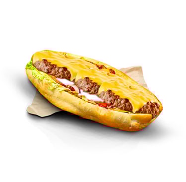 Potato bun, trois keftas smashés, cheddar, sauce ketchup à l'oriental maison, salade, oignons rouges cuits.