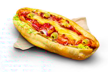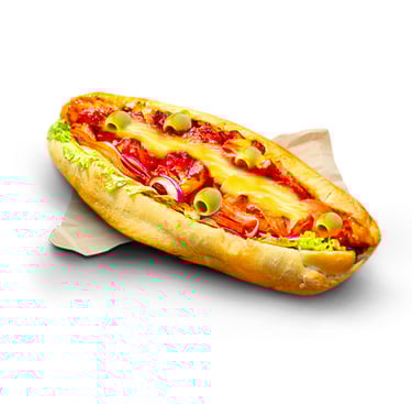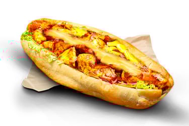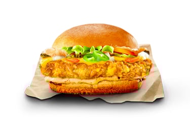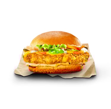 Potato bun, filet de poulet pané maison, cheddar, salade, poivrons, jalapeños, sauce maison.