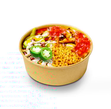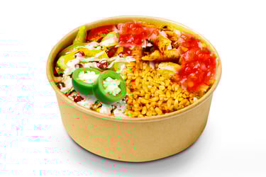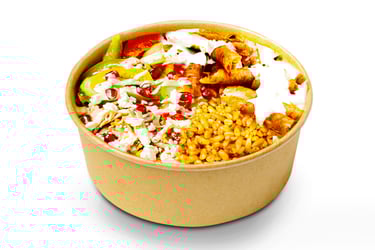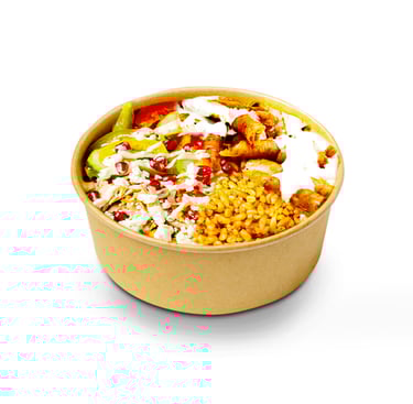 Boulghour, viande de kebab maison, légumes grillés, jalapenos, choux rouge, salade, sauce spicy maison.