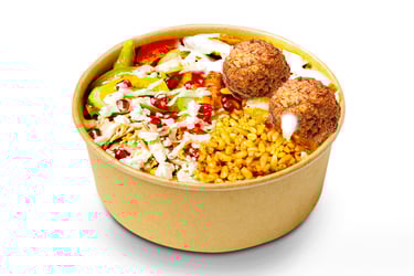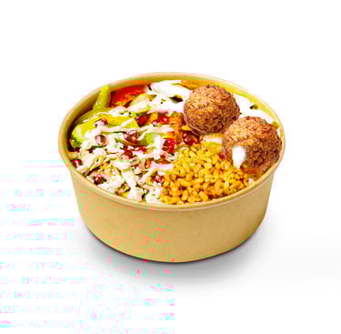Boulghour, falafel, légumes grillés, choux rouge, feta aop, salade, sauce blanche maison.