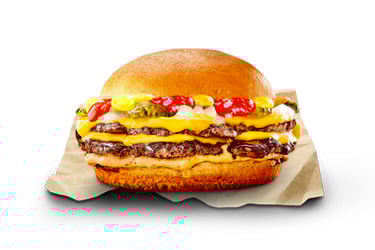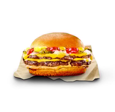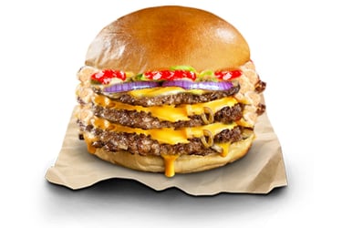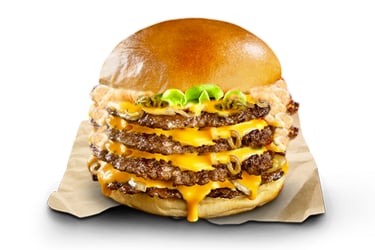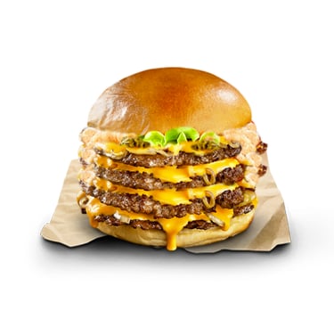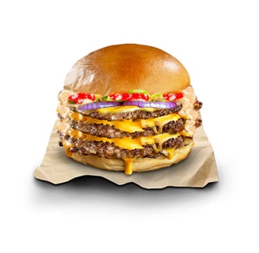 Potato bun, quadruple steak smash, cheddar, salade, oignons, pickles, sauce Biggy.